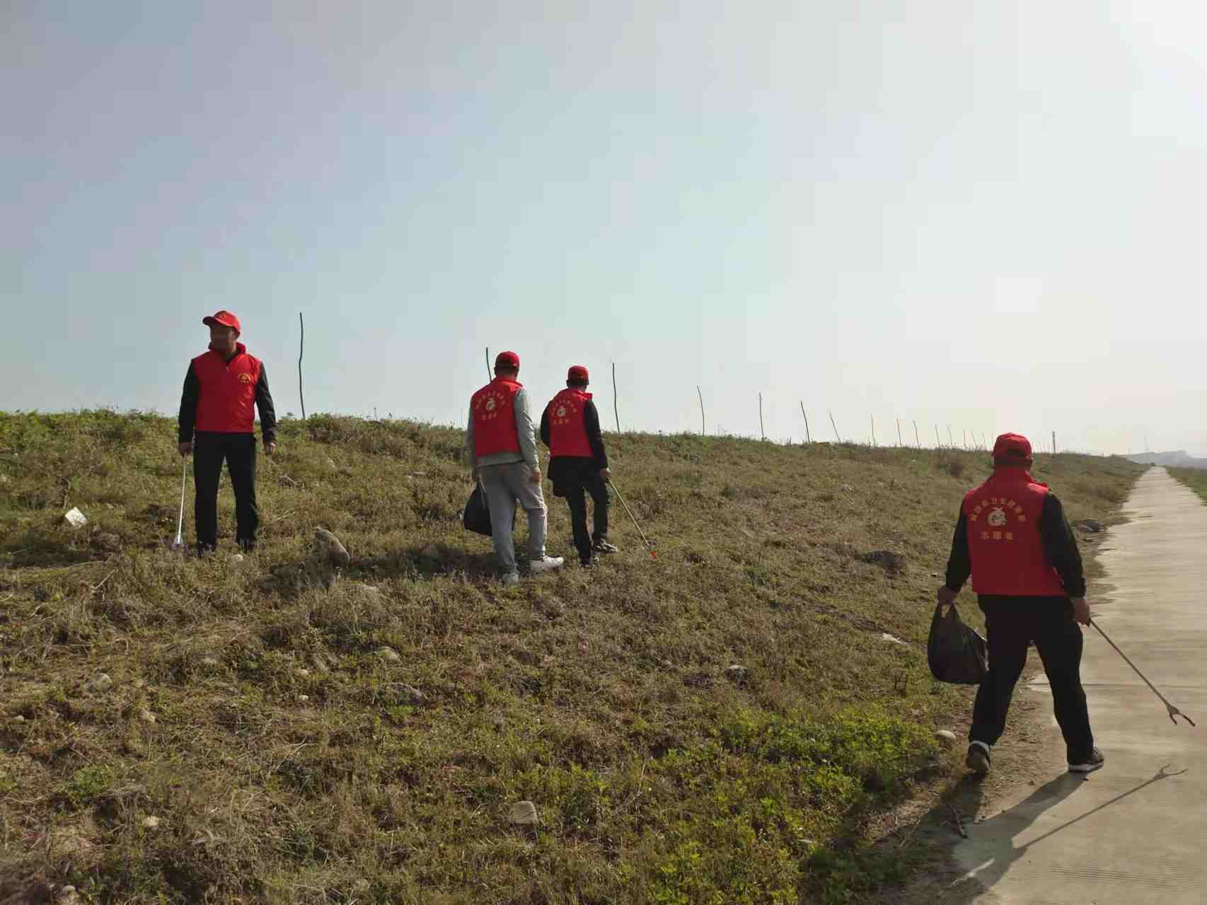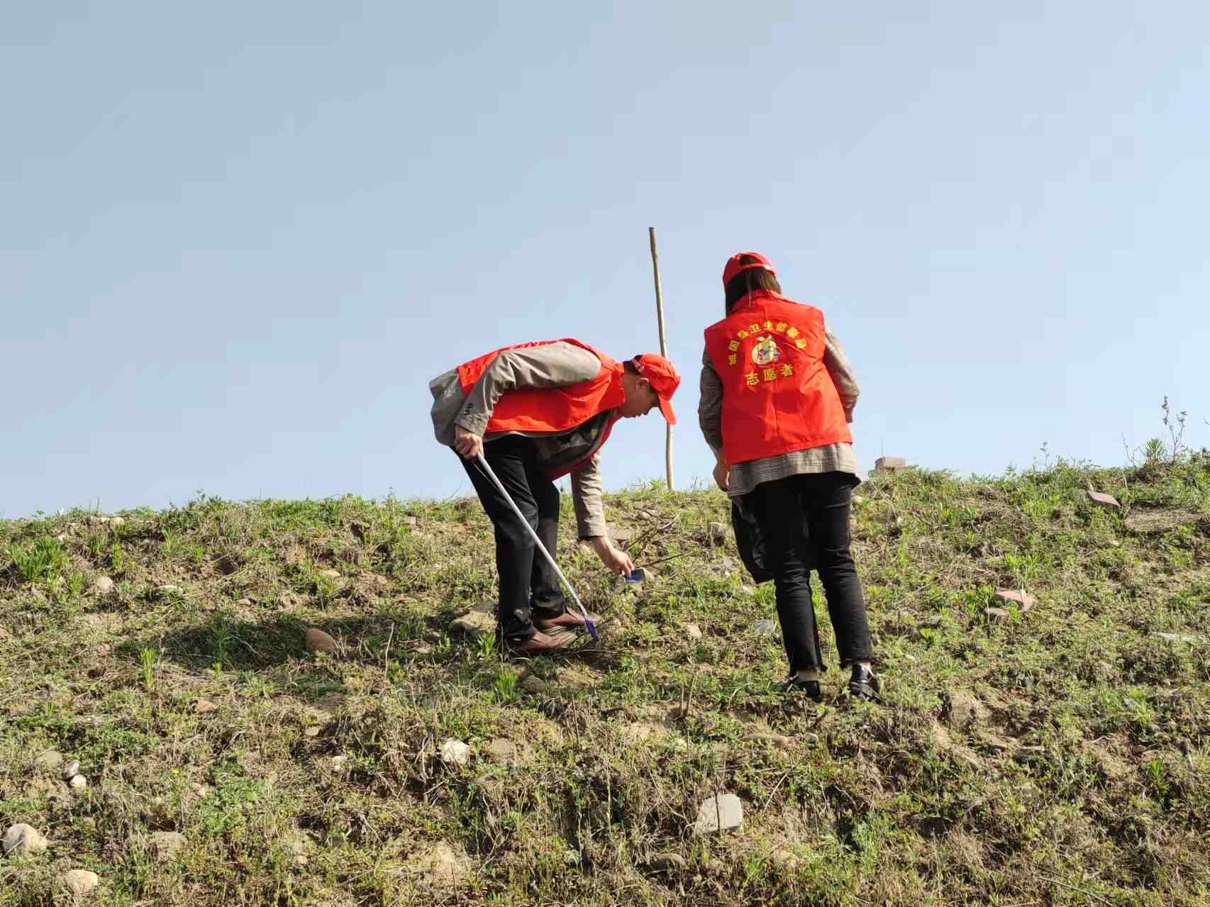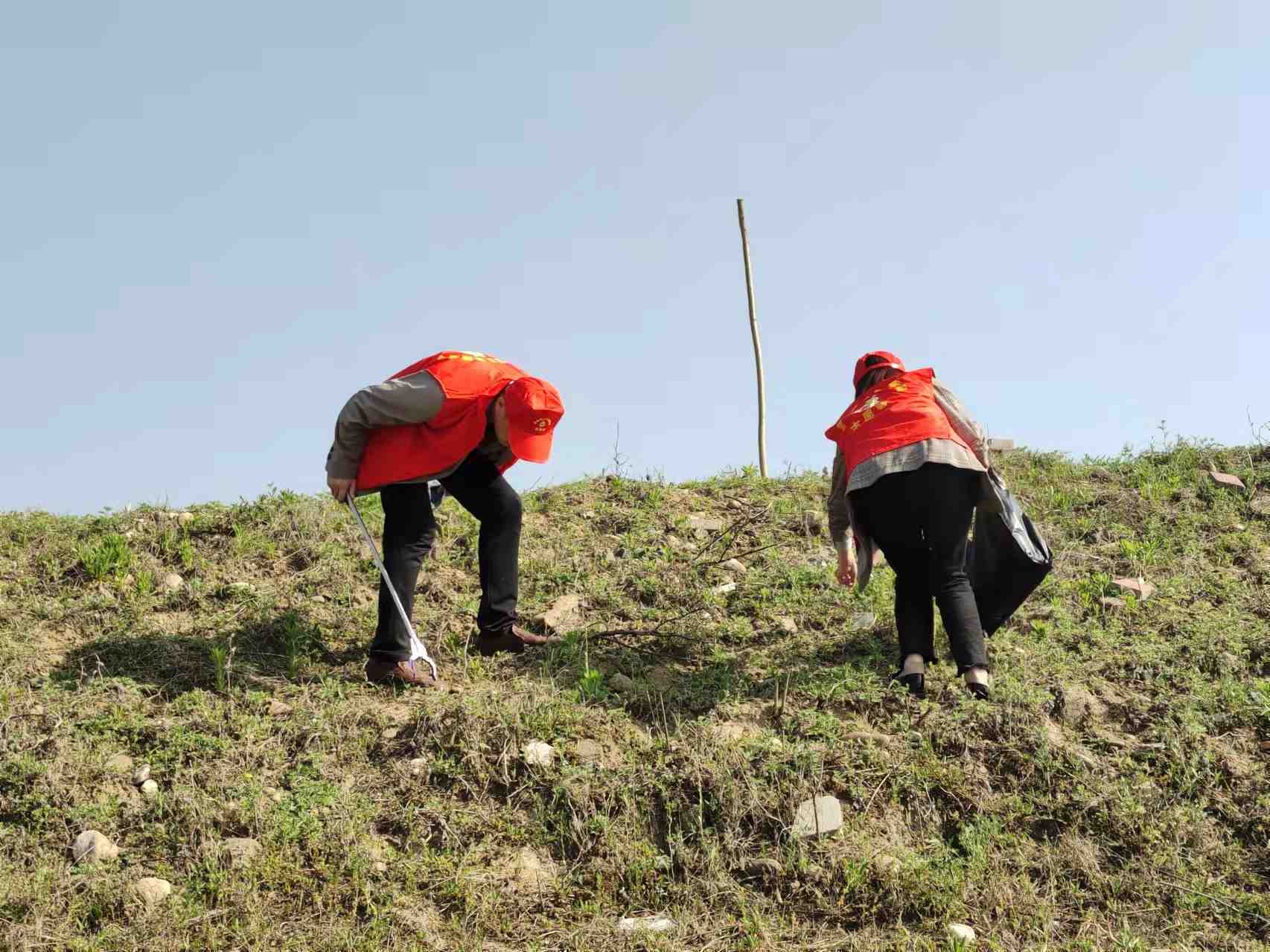 活动中,志愿者们身穿红色马甲,手拿夹子、垃圾袋等清洁工具,沿着沙河营红军渡口,不放过任何烟头、塑料袋