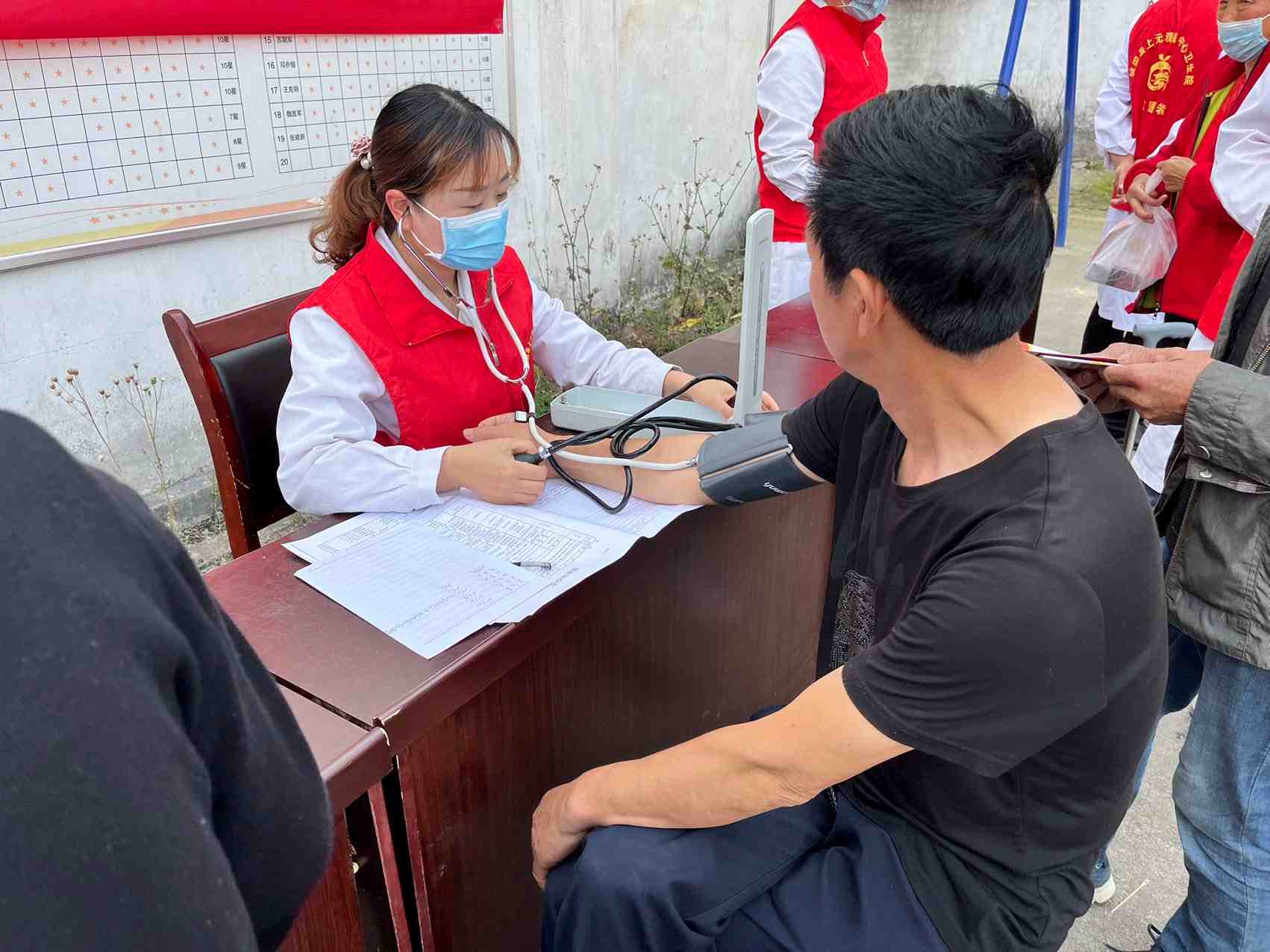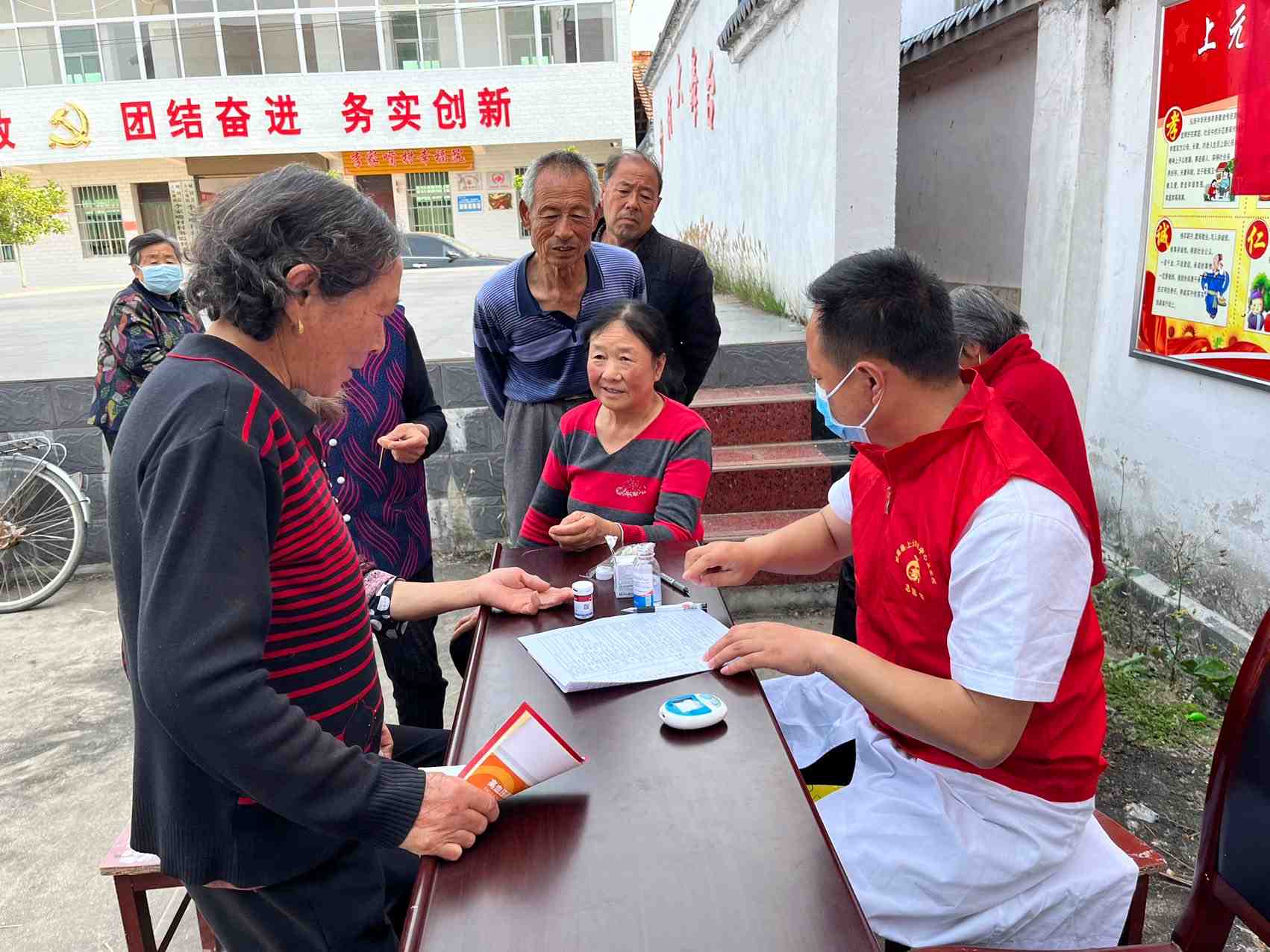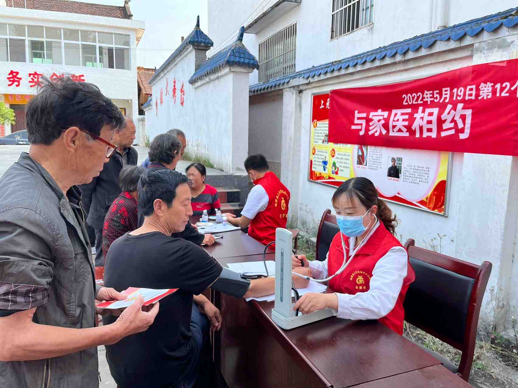 上元观镇中心卫生院组织志愿者到李家嘴村开展“与家医相约、和健康相伴”活动,为当地居民测量血糖血压。