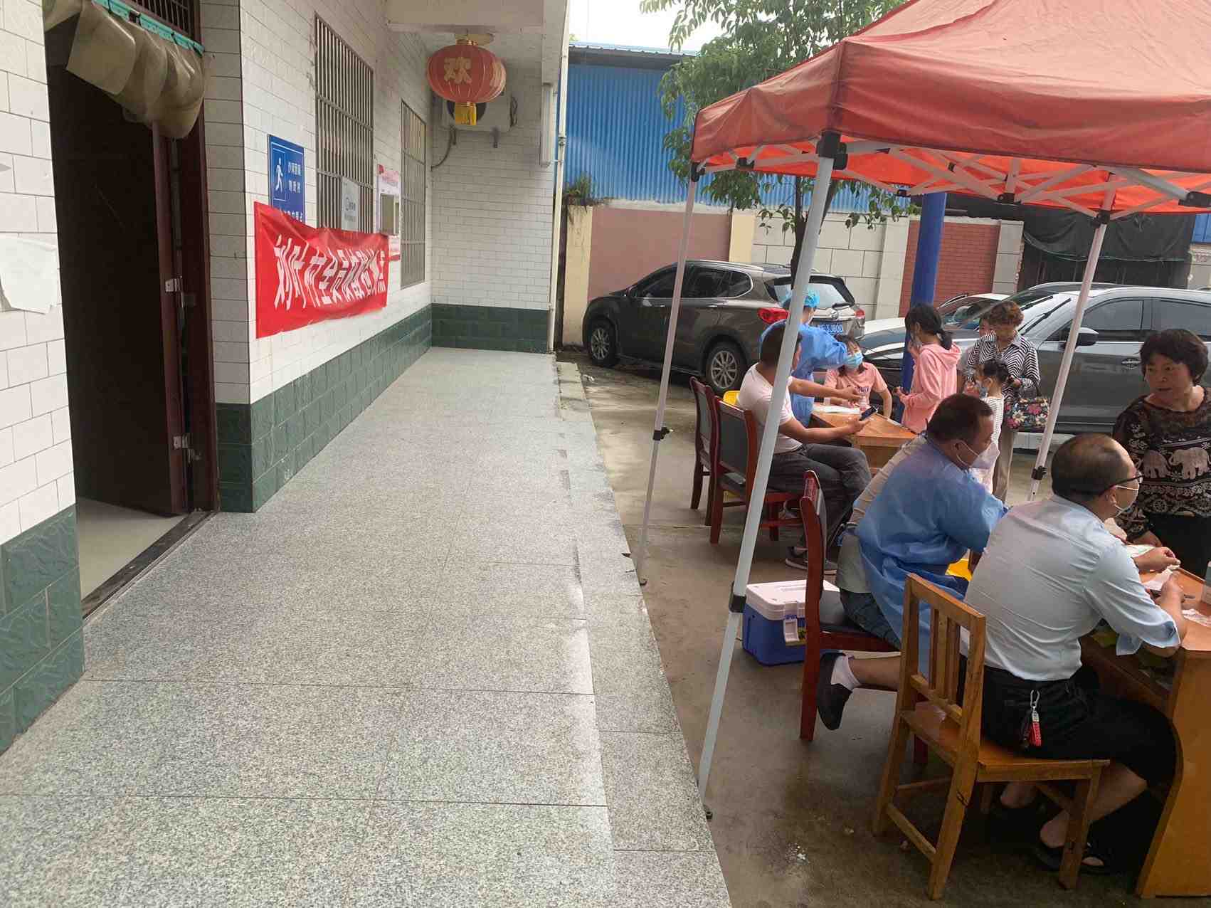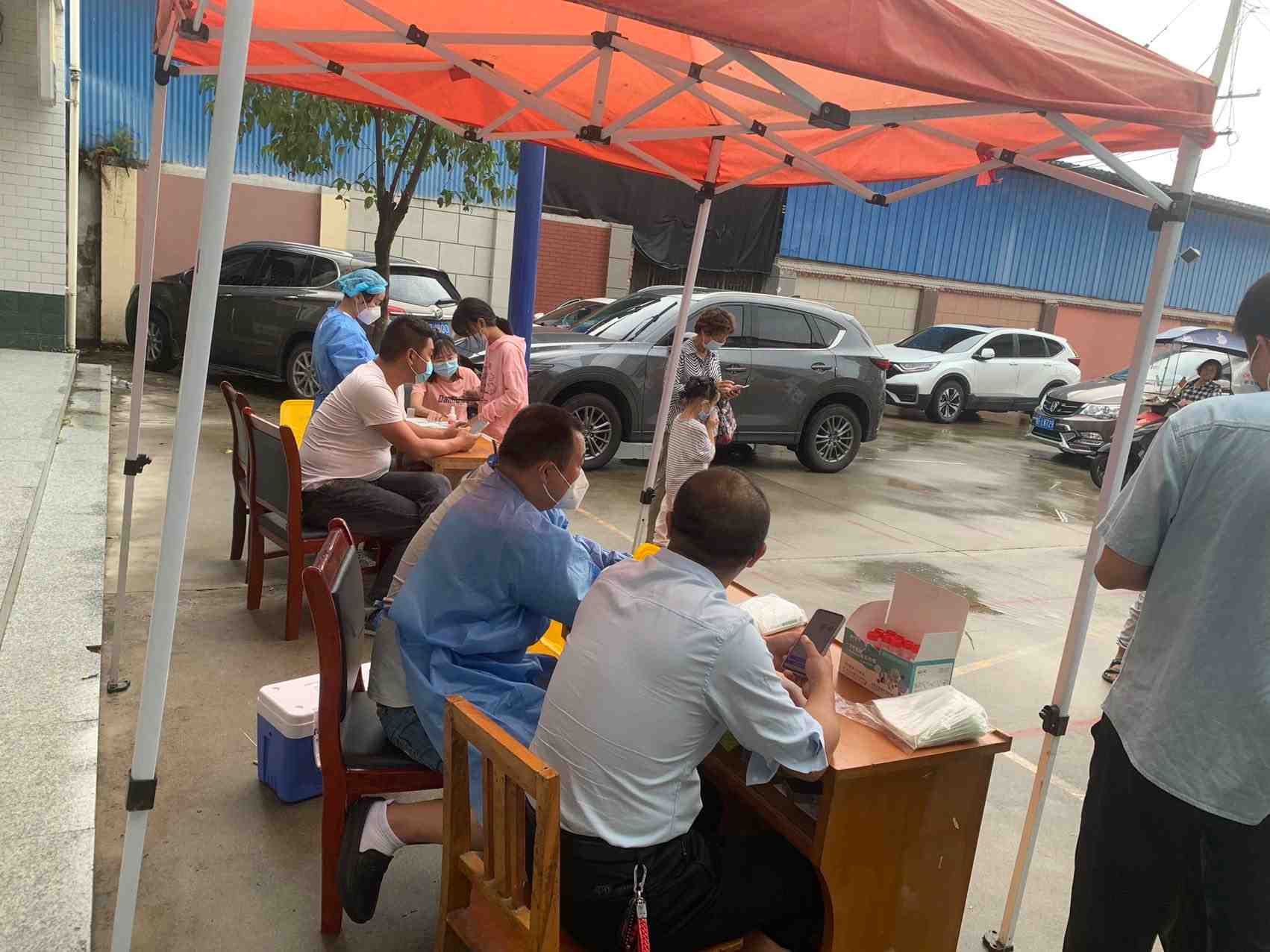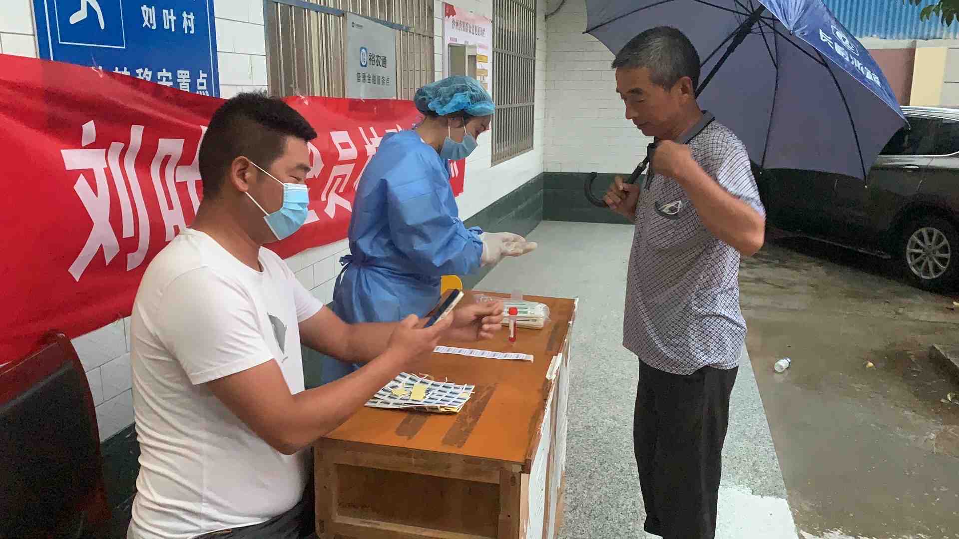 今天天气虽然下着雨,村民们都三三两两的打着雨伞前来做核酸,志愿者们也给大家做好了后勤保障工作。