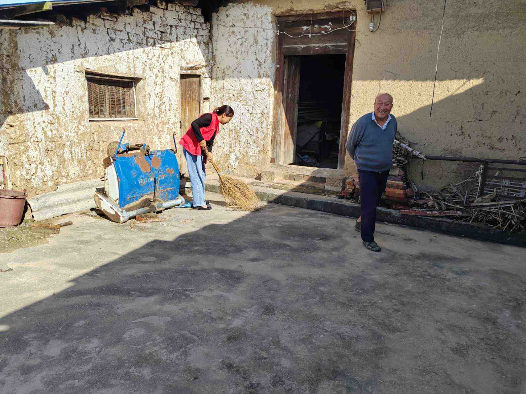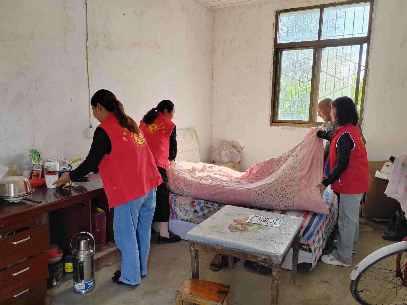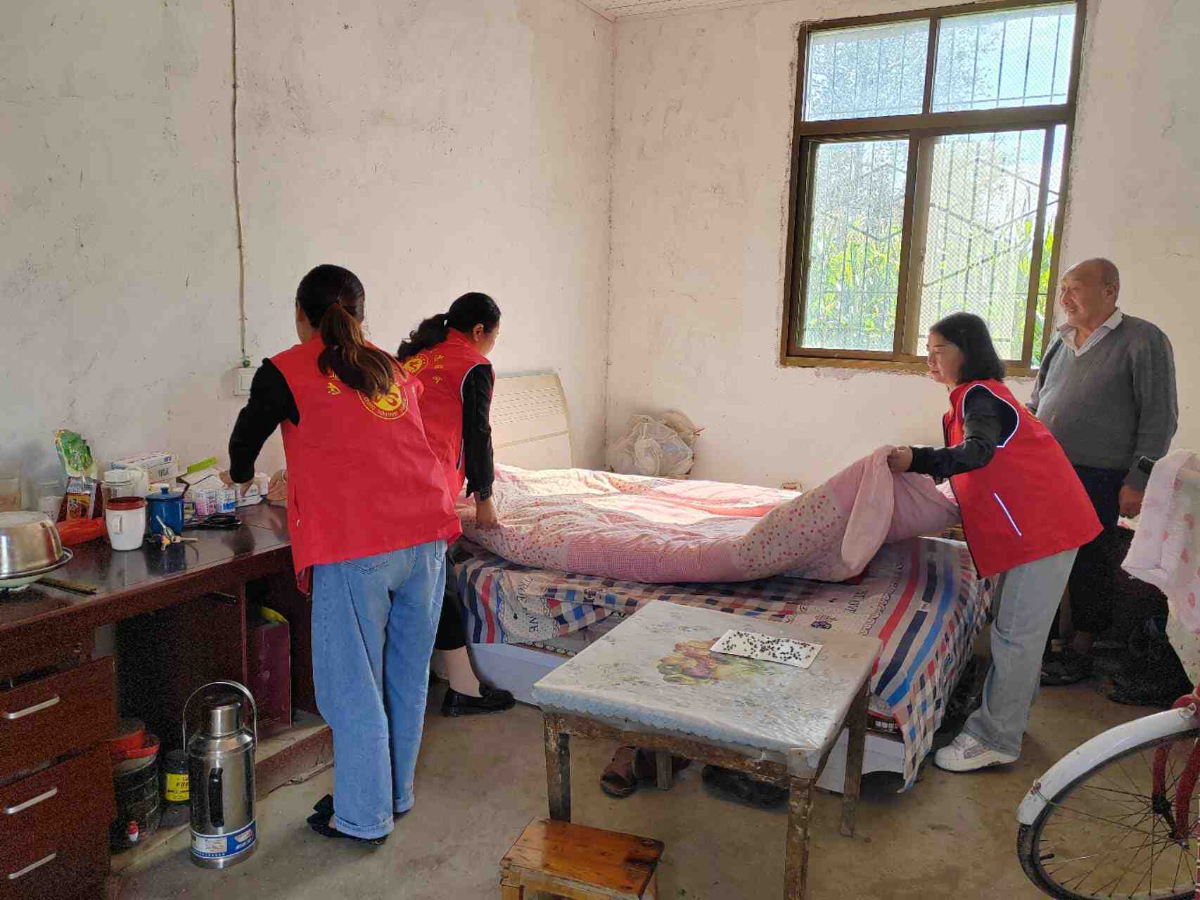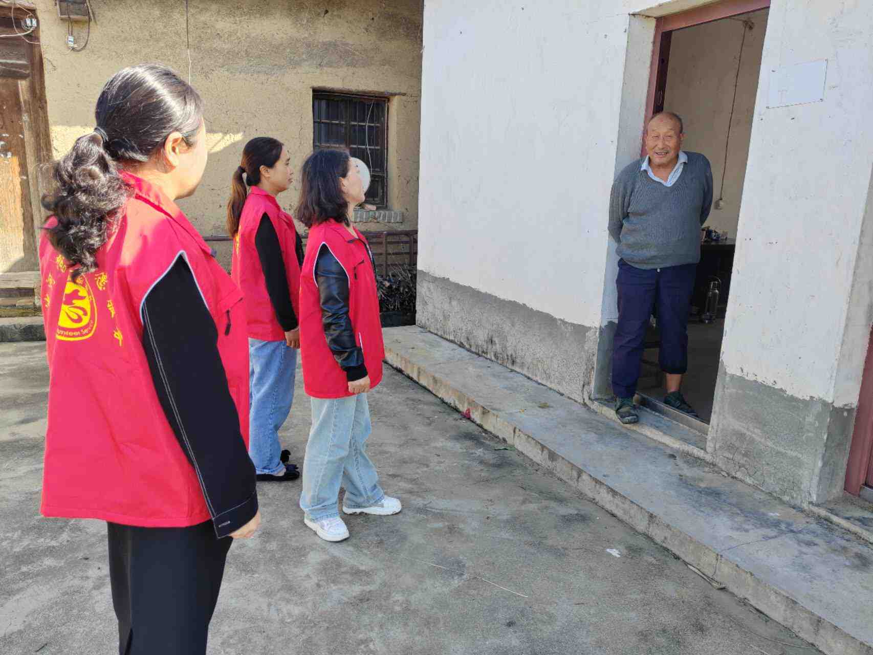 在重阳节即将来临之际,志愿者分组走访村内独居高龄老人,耐心询问老人近期生活状况、帮助老人打扫卫生