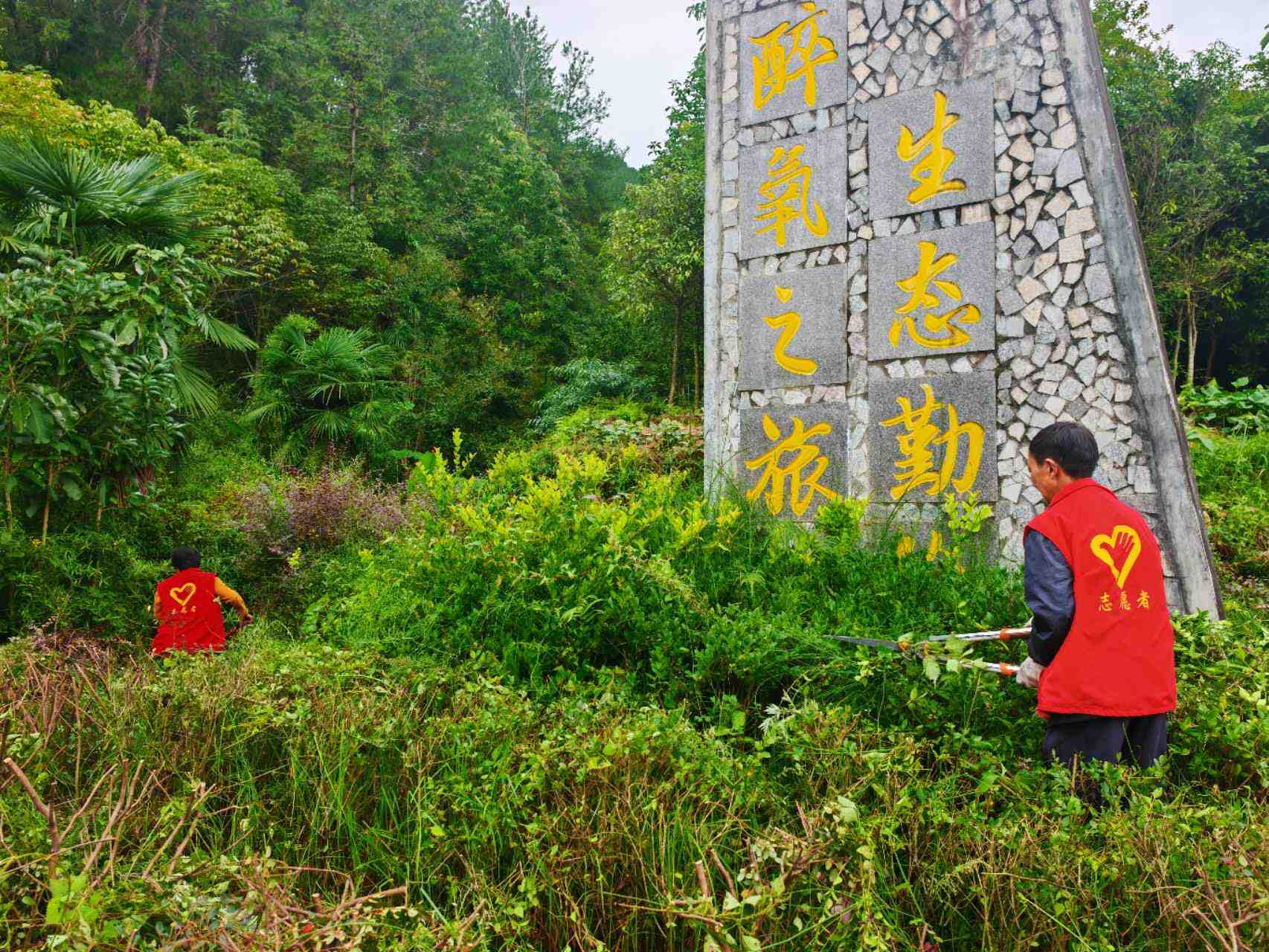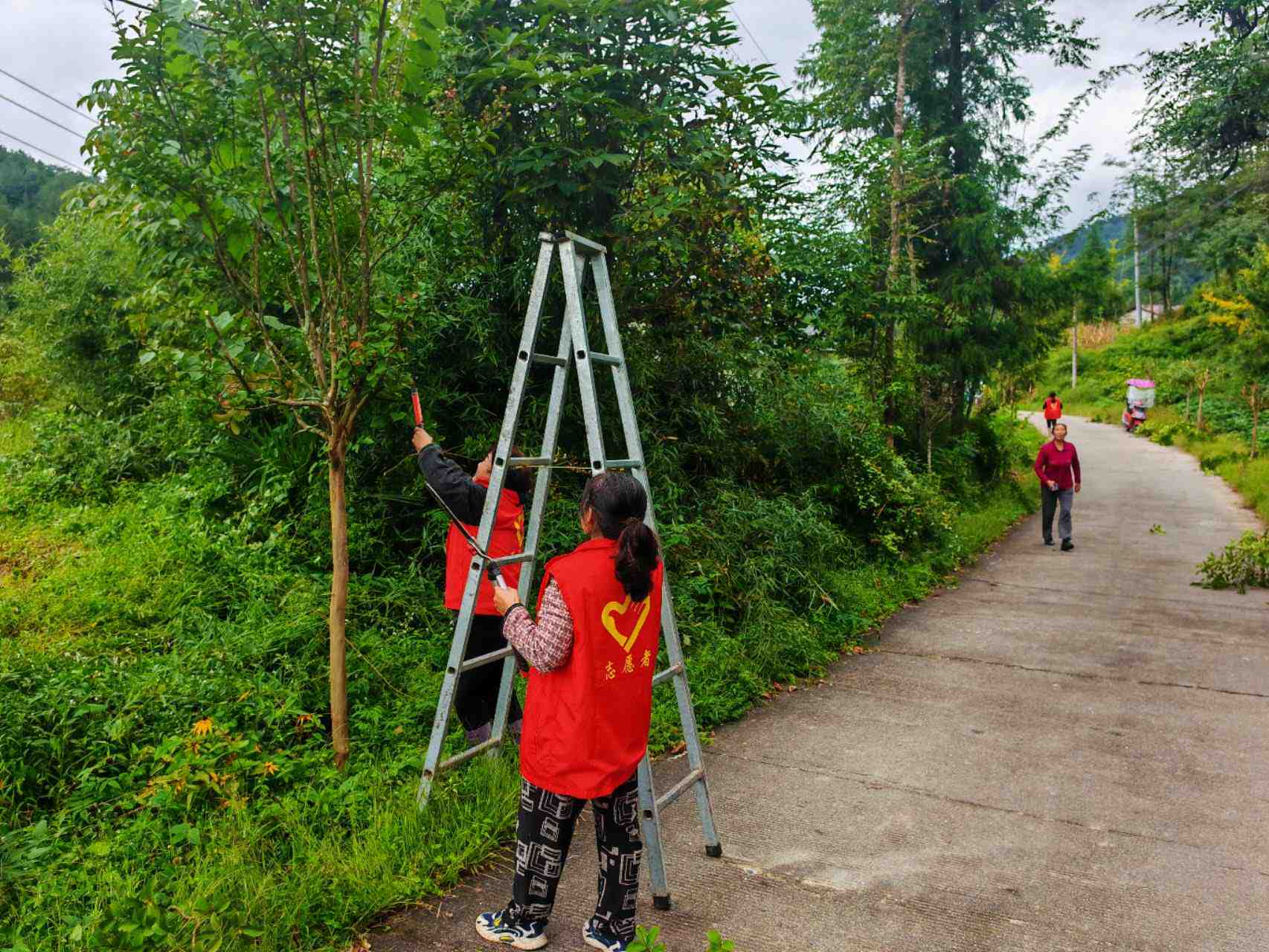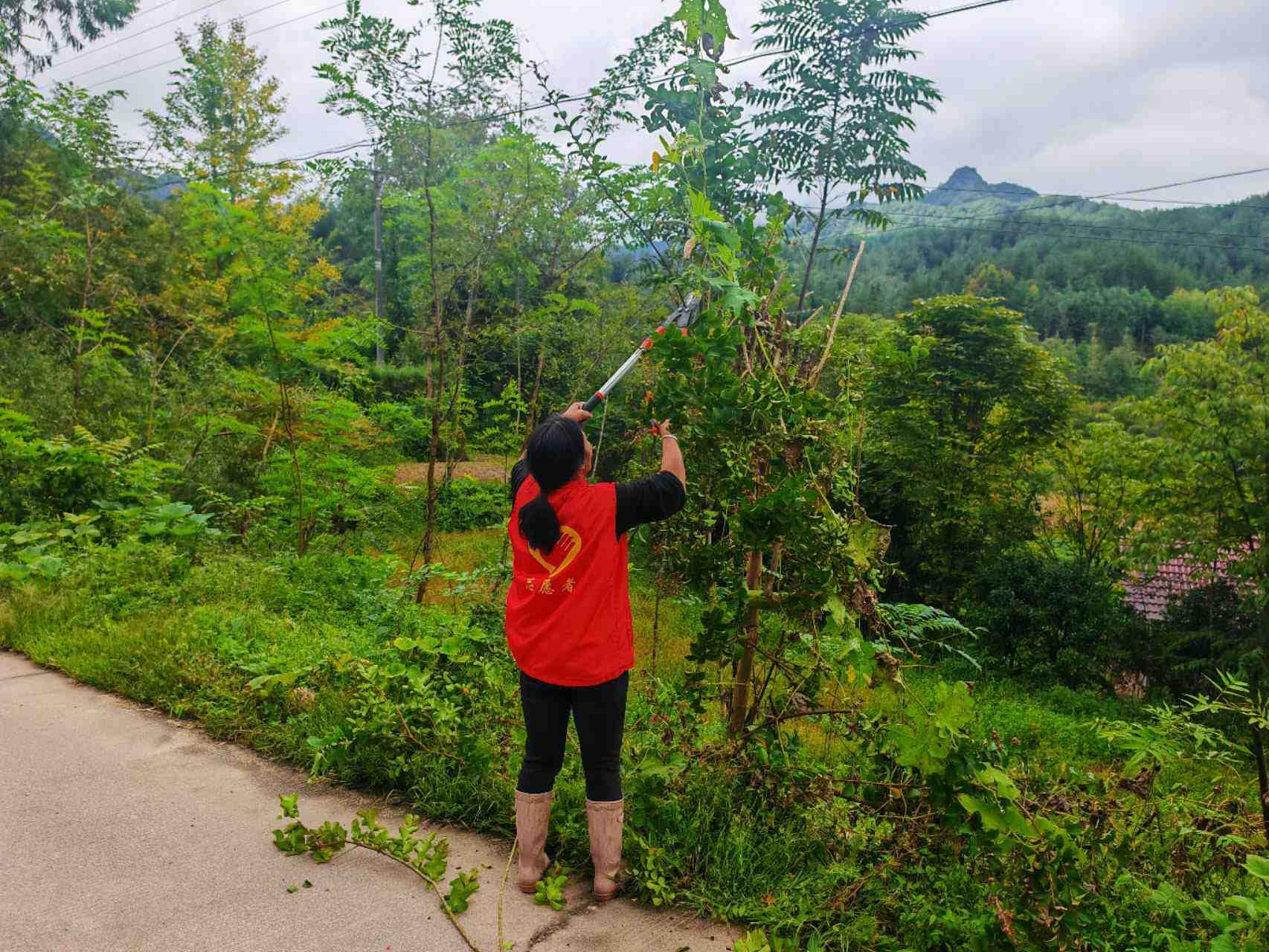 志愿者们对村主干道的绿化进行了修剪和清理,提升了村容村貌。