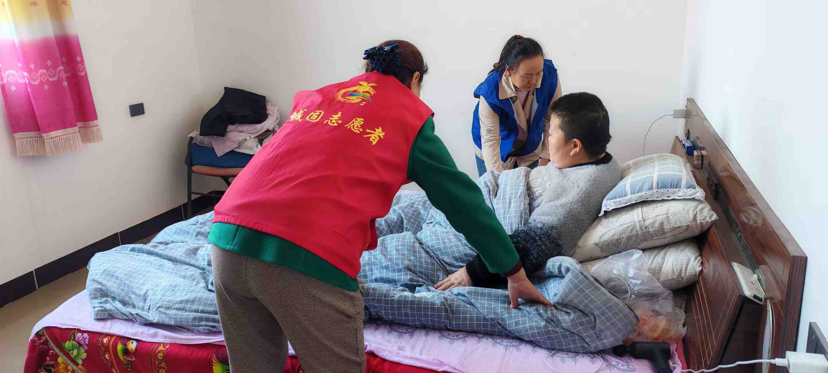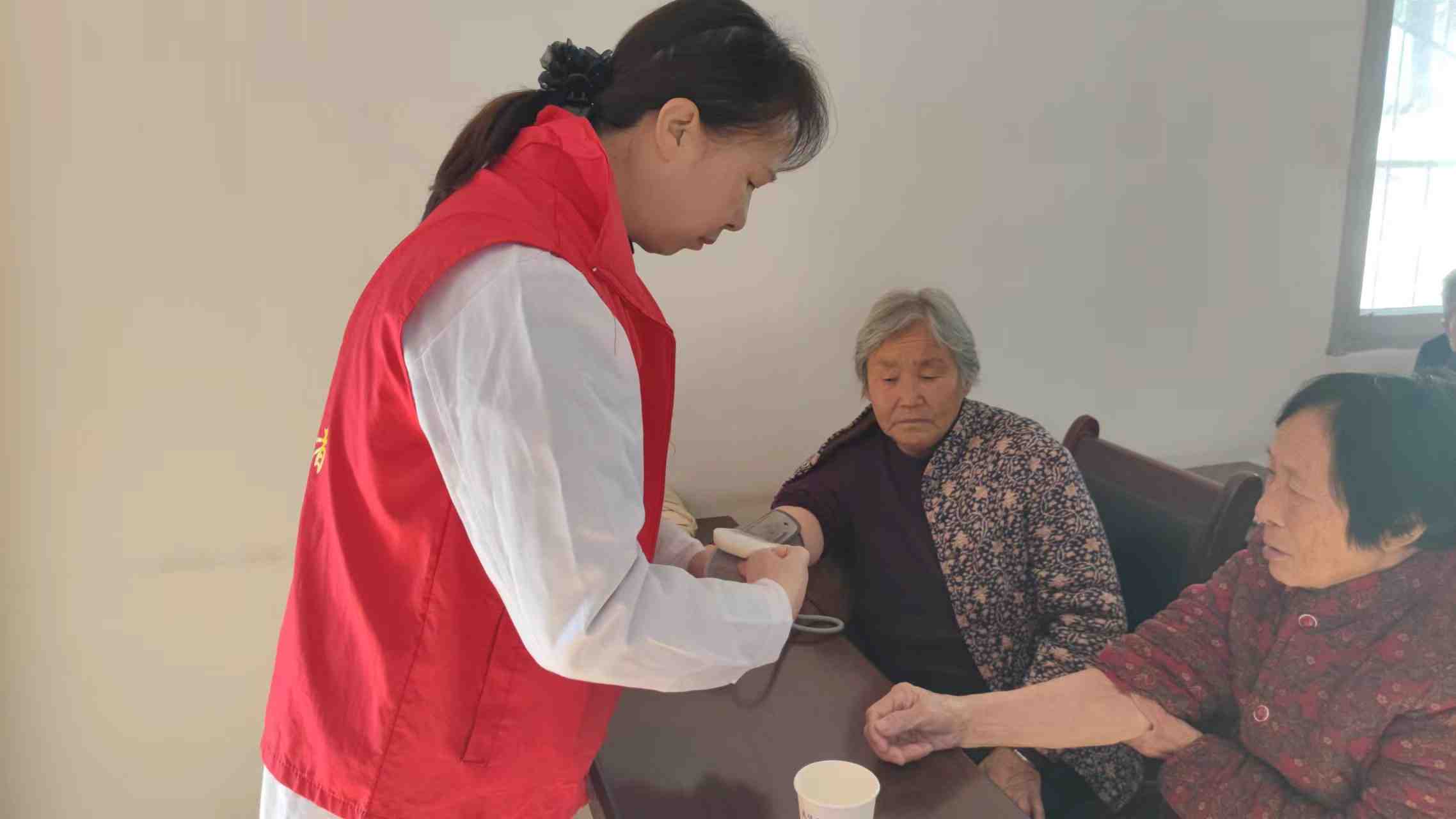 重阳节当天,文苏村新时代文明实践站志愿者开展关心关爱活动,为老人测量血压,为残疾人打扫卫生。