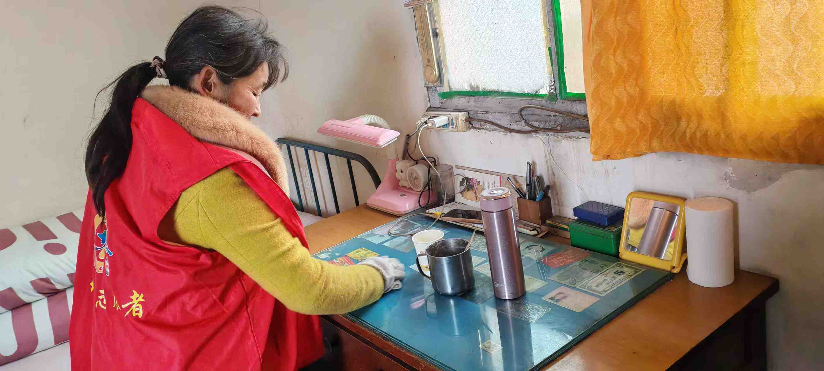 文苏村新时代文明实践站志愿者开展关心关爱活动,为退役老兵打扫卫生并送去党的关怀中国结“福”字。