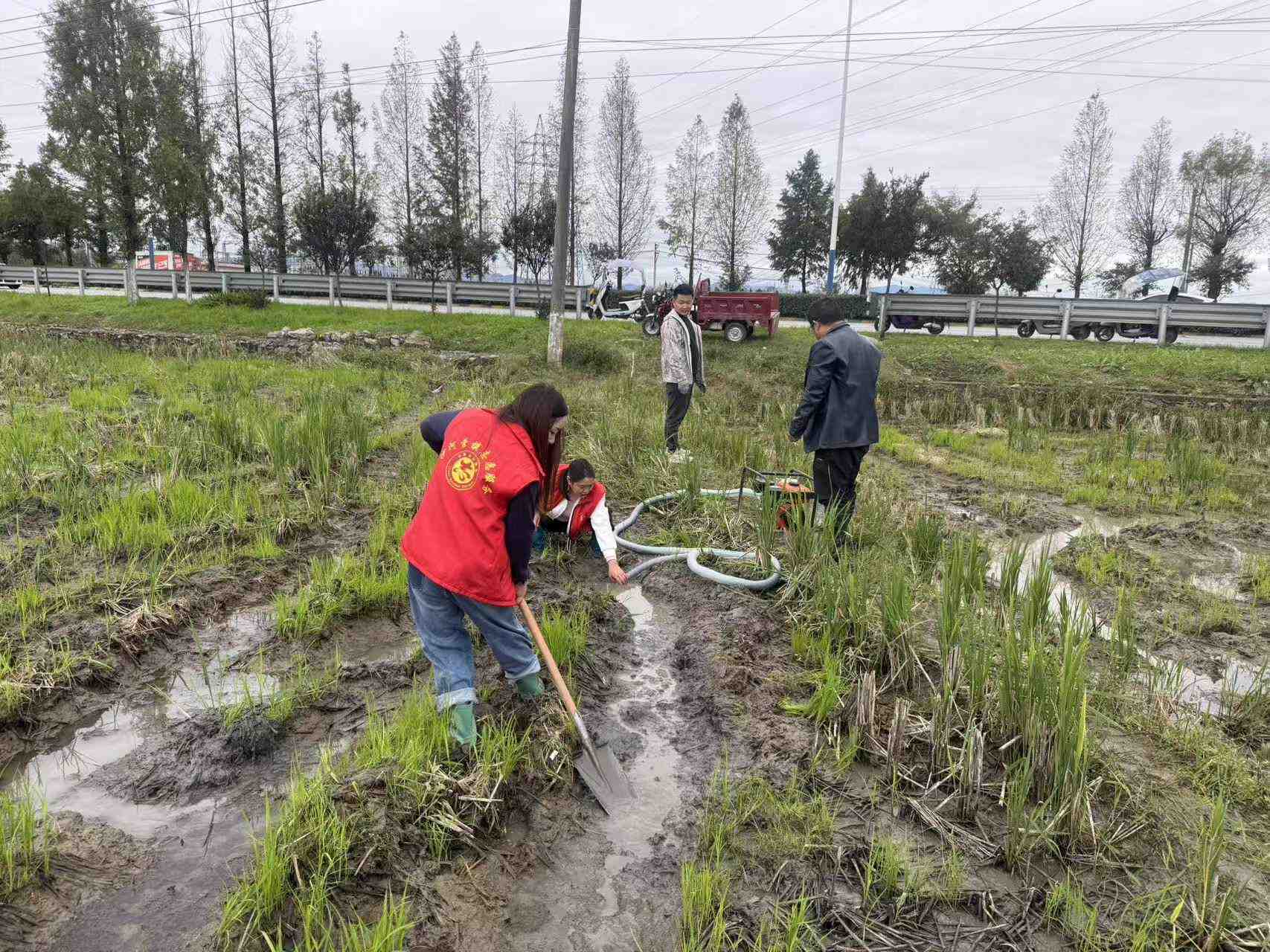 各村志愿者们充分了发挥“服务为民,冲锋在前”的本色,结合农田地形,迅速制定“疏通沟渠、临时导流”的科学方案:有手持铁锹清理田间的沟渠、农沟内的秸秆、杂物和泥沙,确保排水通道畅通;有合力搬运、架设抽水泵和排水管,将低洼地块的积水快速抽排到干沟;虽然雨水混着泥土浸湿了衣裤,但大家没有丝毫退缩。