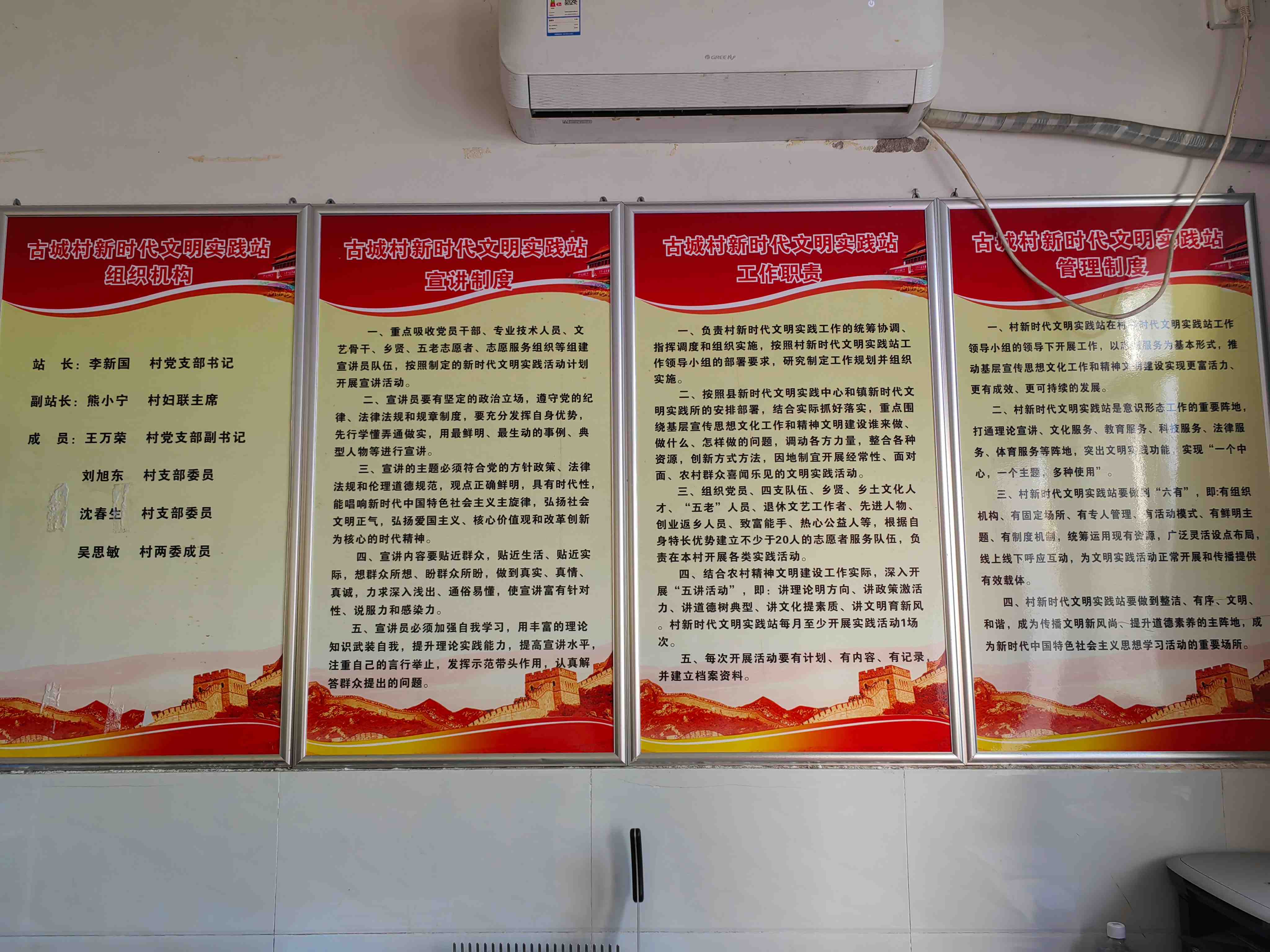 古城村新时代文明实践站组织志愿者服务队高举新时代文明旗帜,身穿志愿者红马甲,一边手举大喇叭在村内进行防控知识宣传;一边劝阻村民不走亲戚、不访友,不串门,勤洗手、戴口罩、不聚餐、不打牌;一边挨家挨户发放新型冠状病毒肺炎防控知识宣传单;一边对外出返乡农民工再次摸排登记;一边劝阻群众不聚餐、不聚会、不打牌。古城村新时代文明实践站组织志愿者服务队对每位进出村子的村民进行体温测量,务工地址、行程进行登记,防止每一个可疑的新型冠状病毒肺炎携带者进入我村。古城村新时代文明实践站组织志愿者服务队对村域内环境进行打扫,消毒。