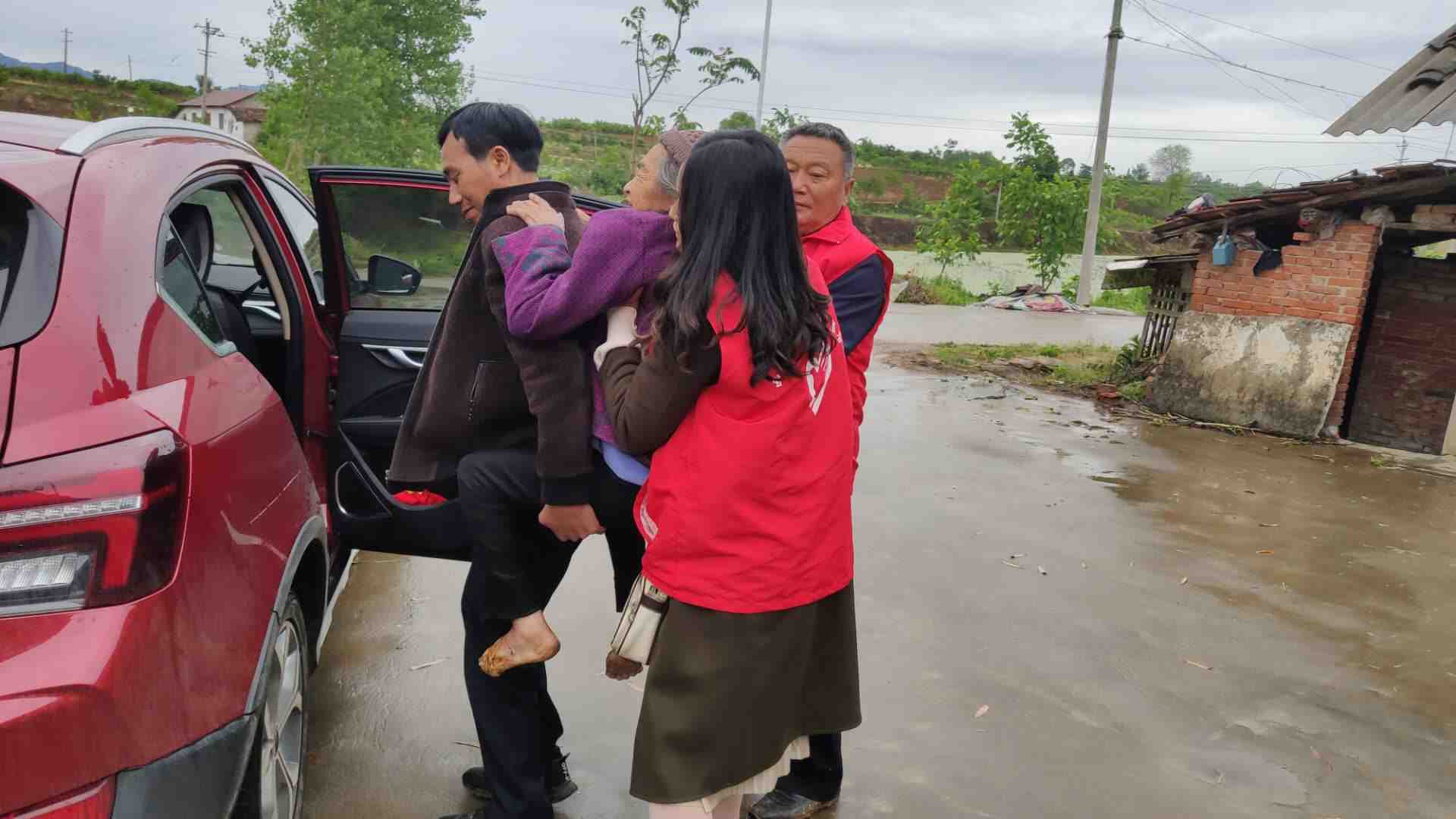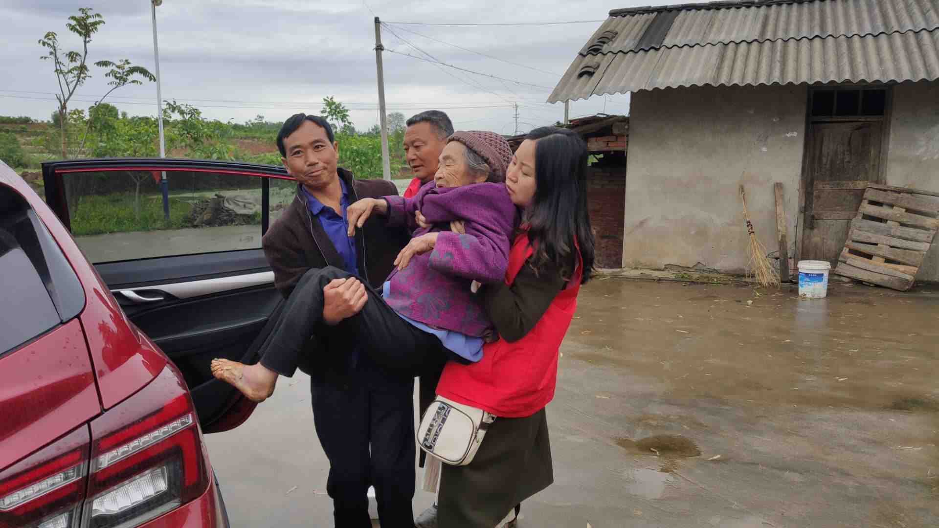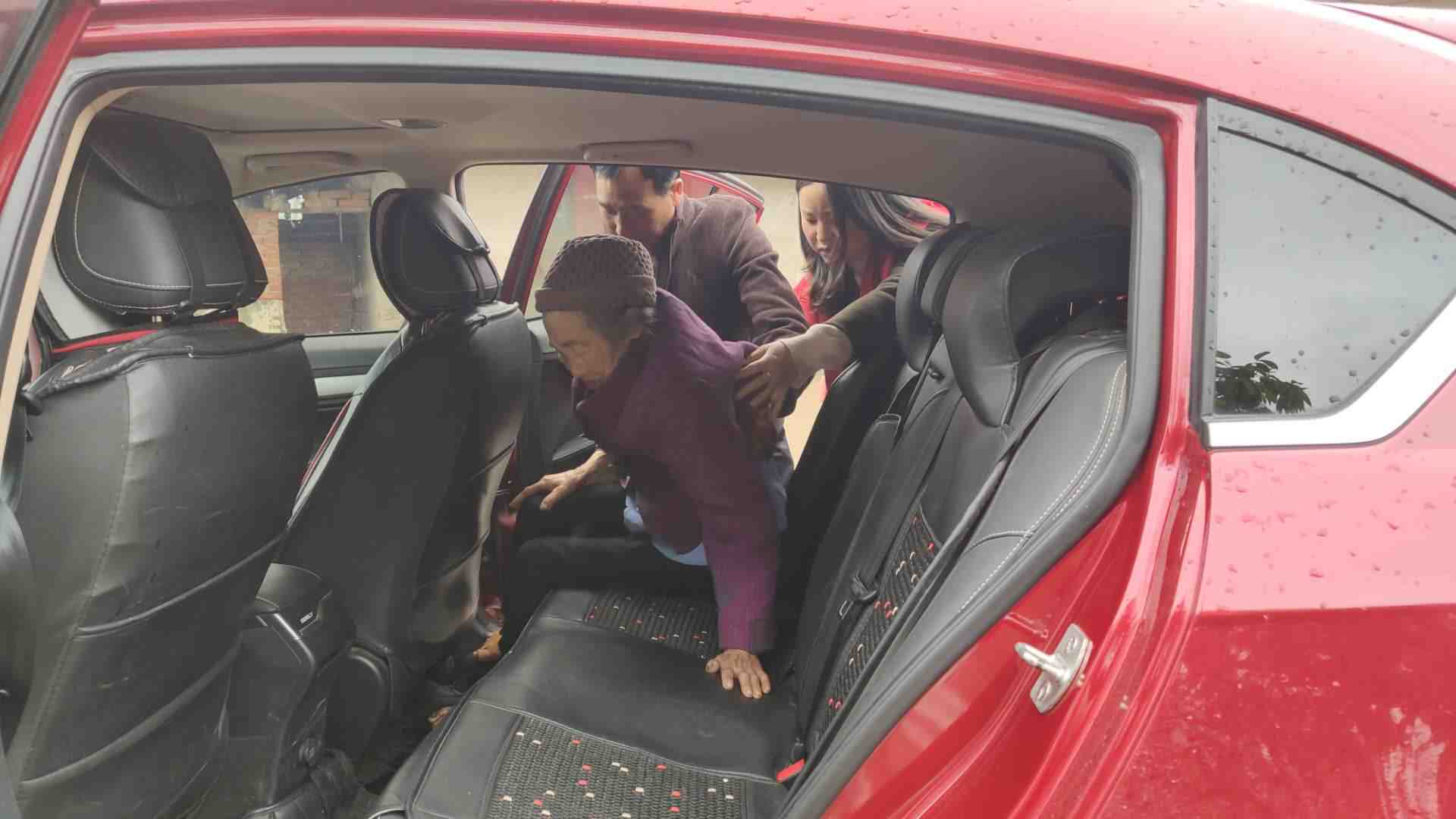 留孤寡老人柳安春,脚被烫伤,我村志愿者每天开车接送去镇卫生院就诊