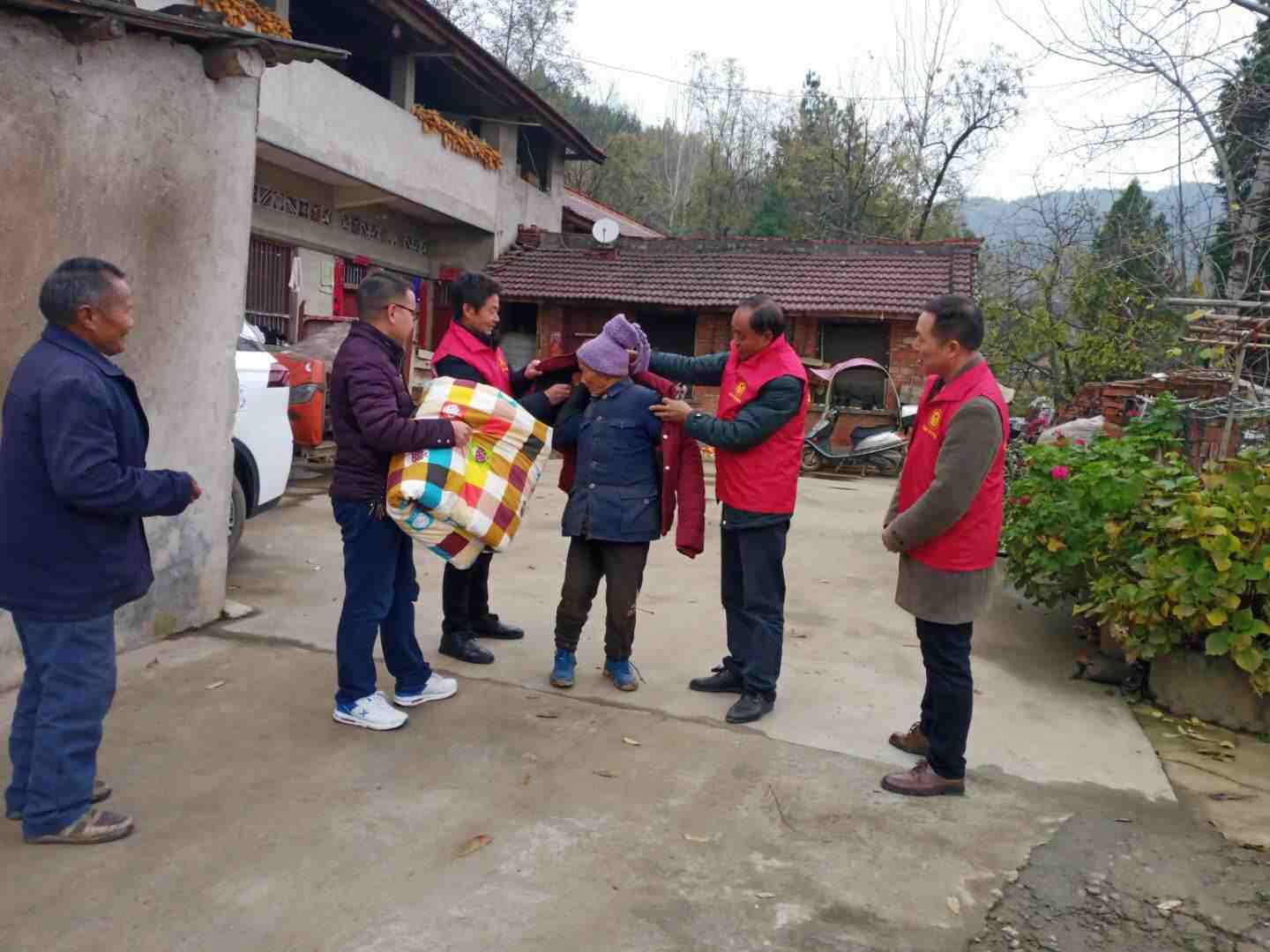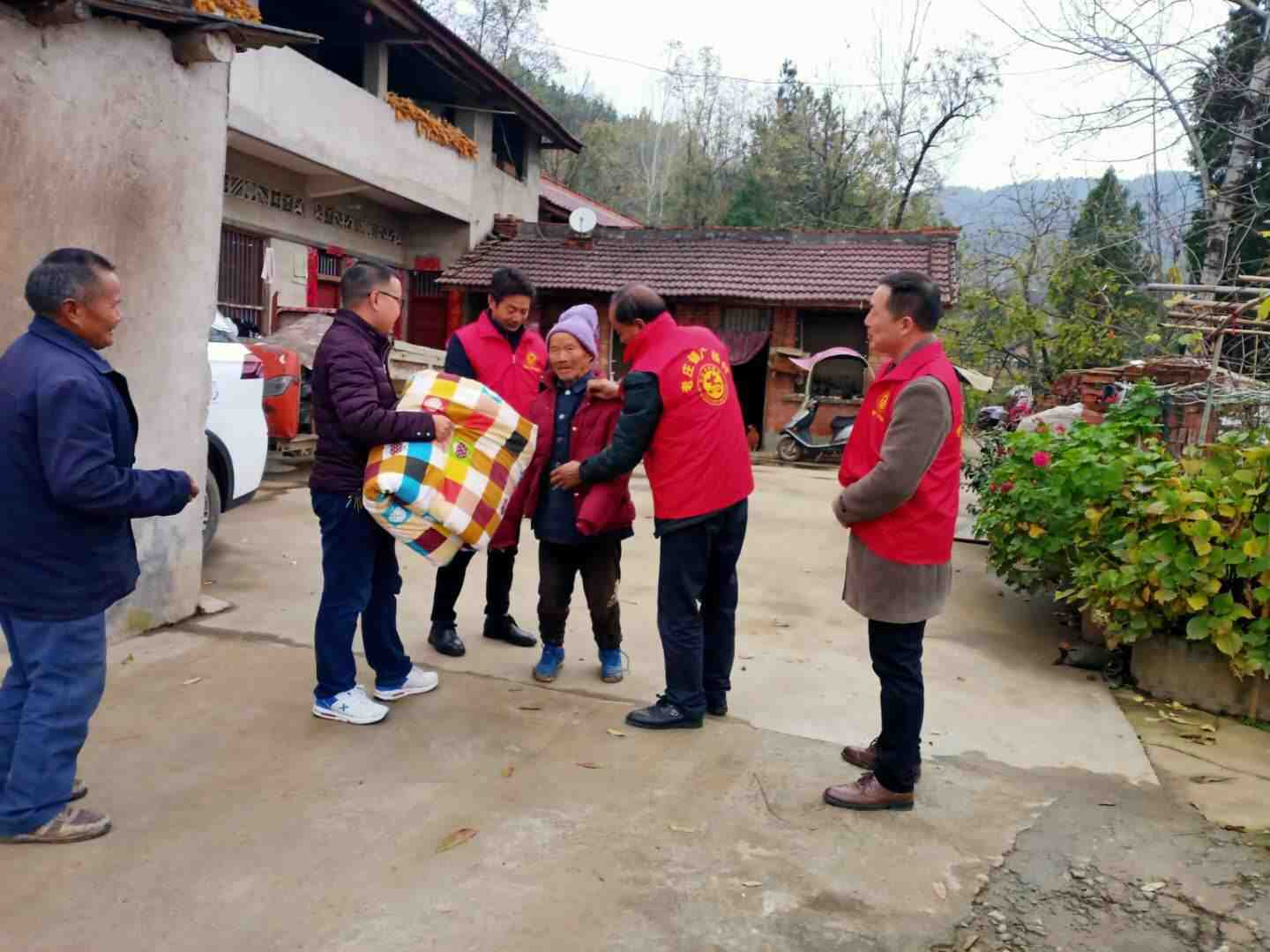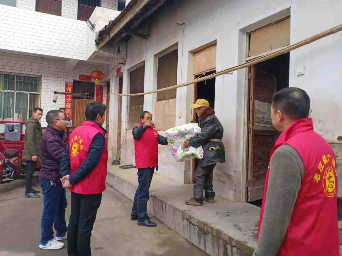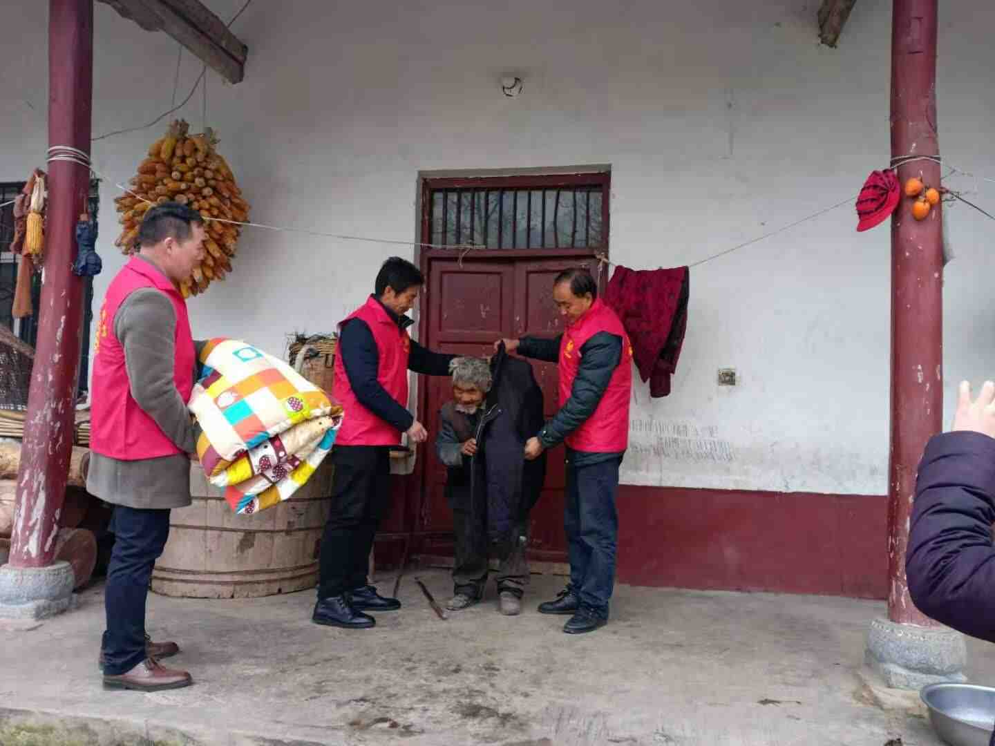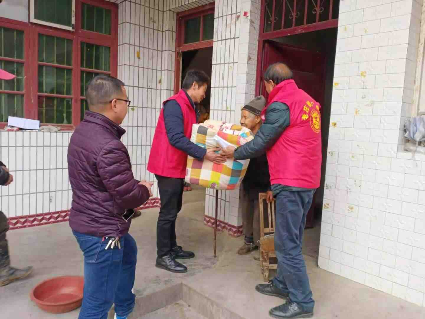 广杨村支书杨新武,驻村工作队长卢栋和包村干部张新基,广杨村副支书走访贫困户分散五保户发放棉被,棉袄