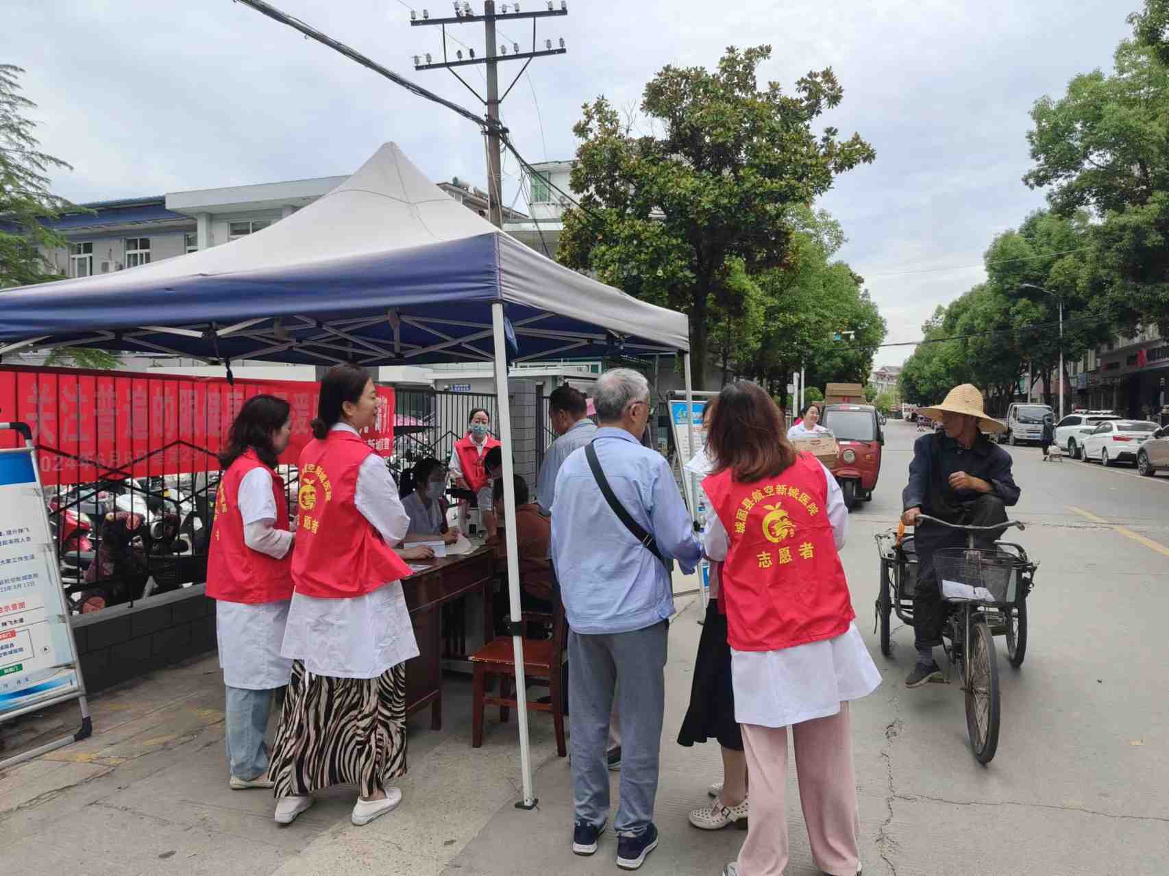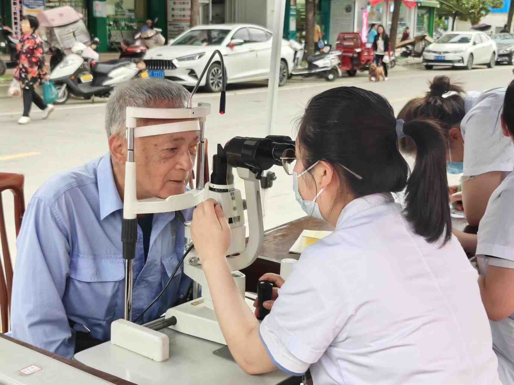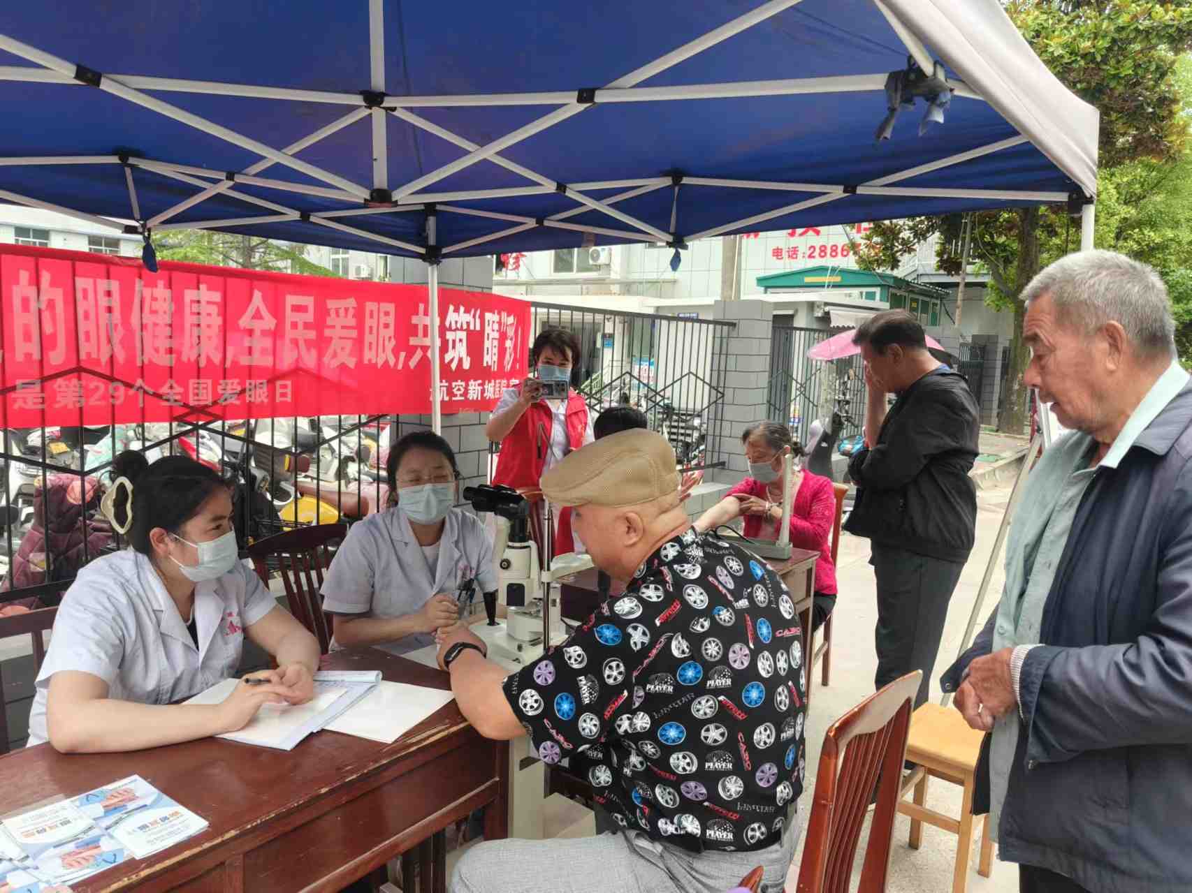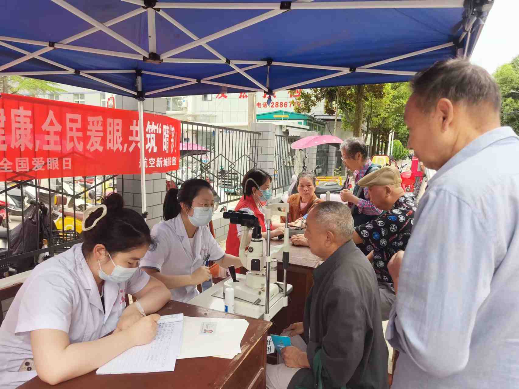 城固县航空新城医院开展全国爱眼日宣传义诊活动现场,照片中眼科大夫正在忙碌地为群众进行免费的眼健康检查