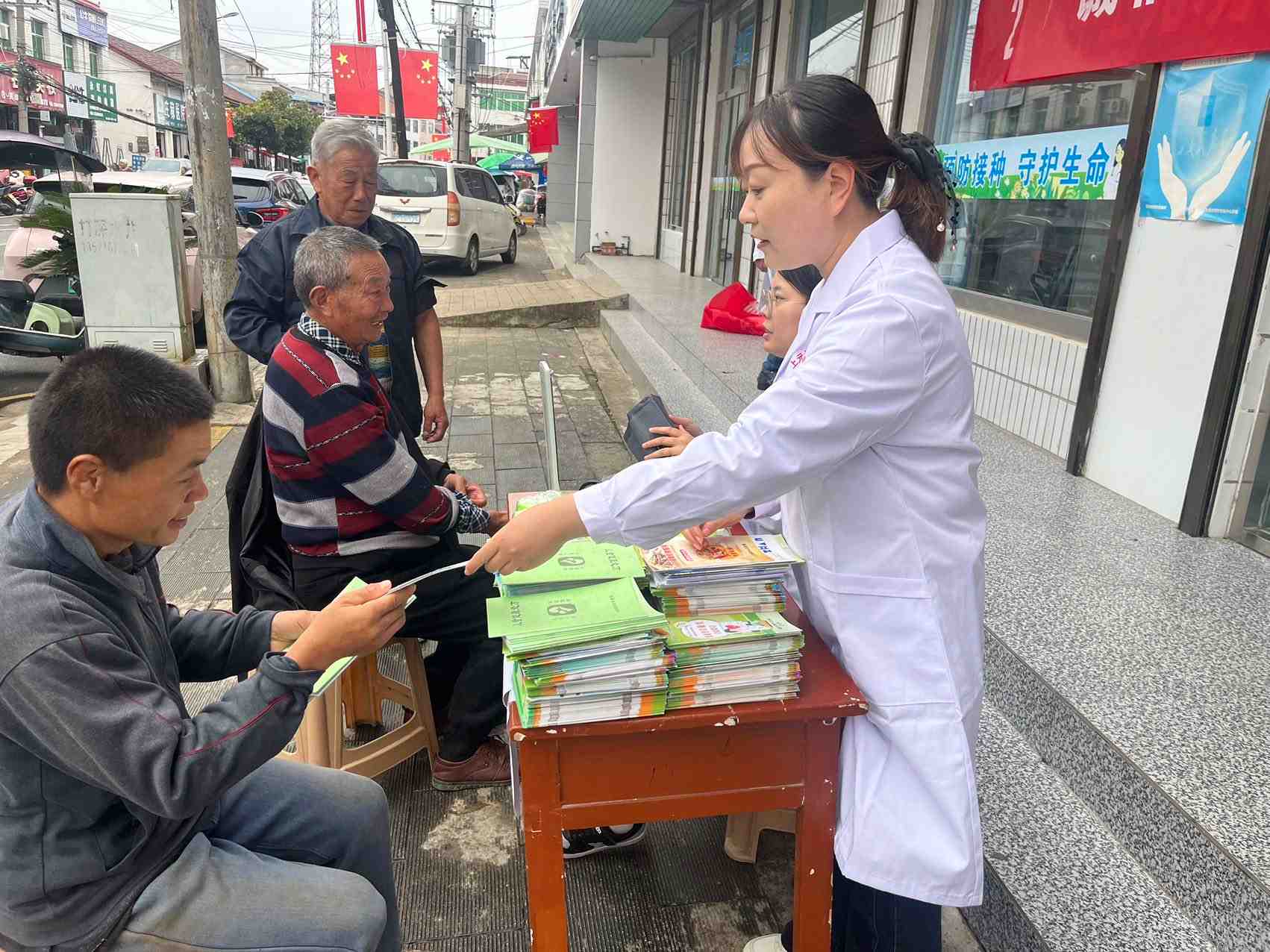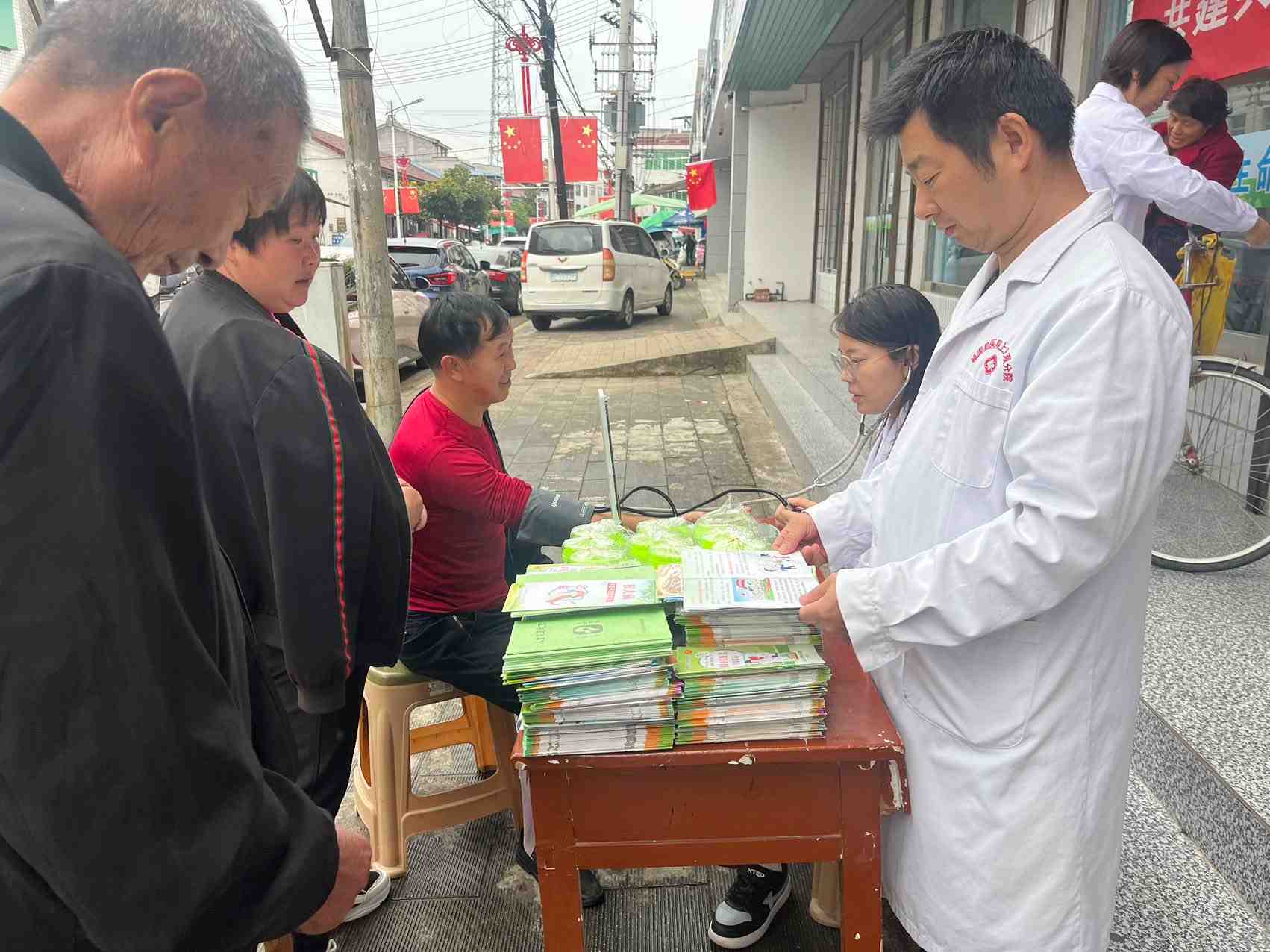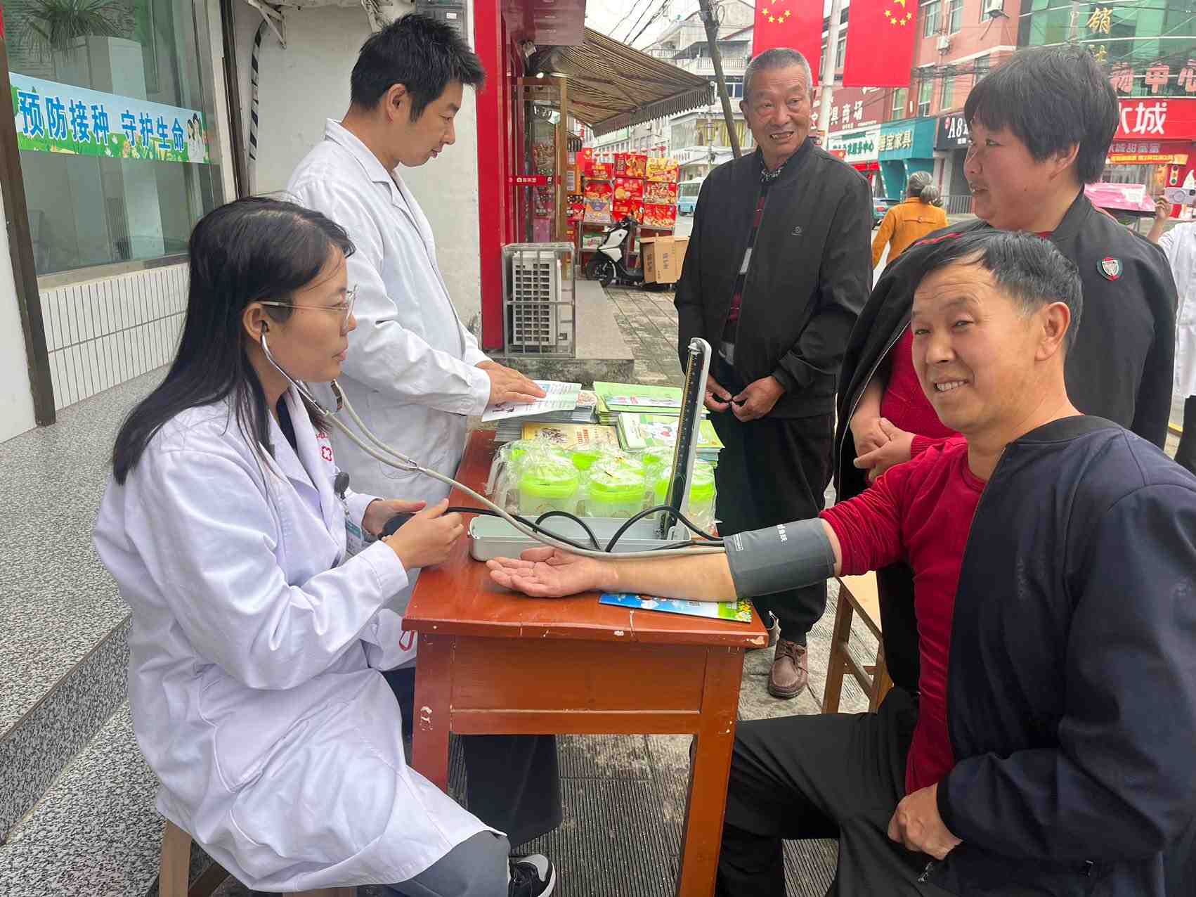 为老年人测量血压,进行健康知识宣教,得到群众一致好评!