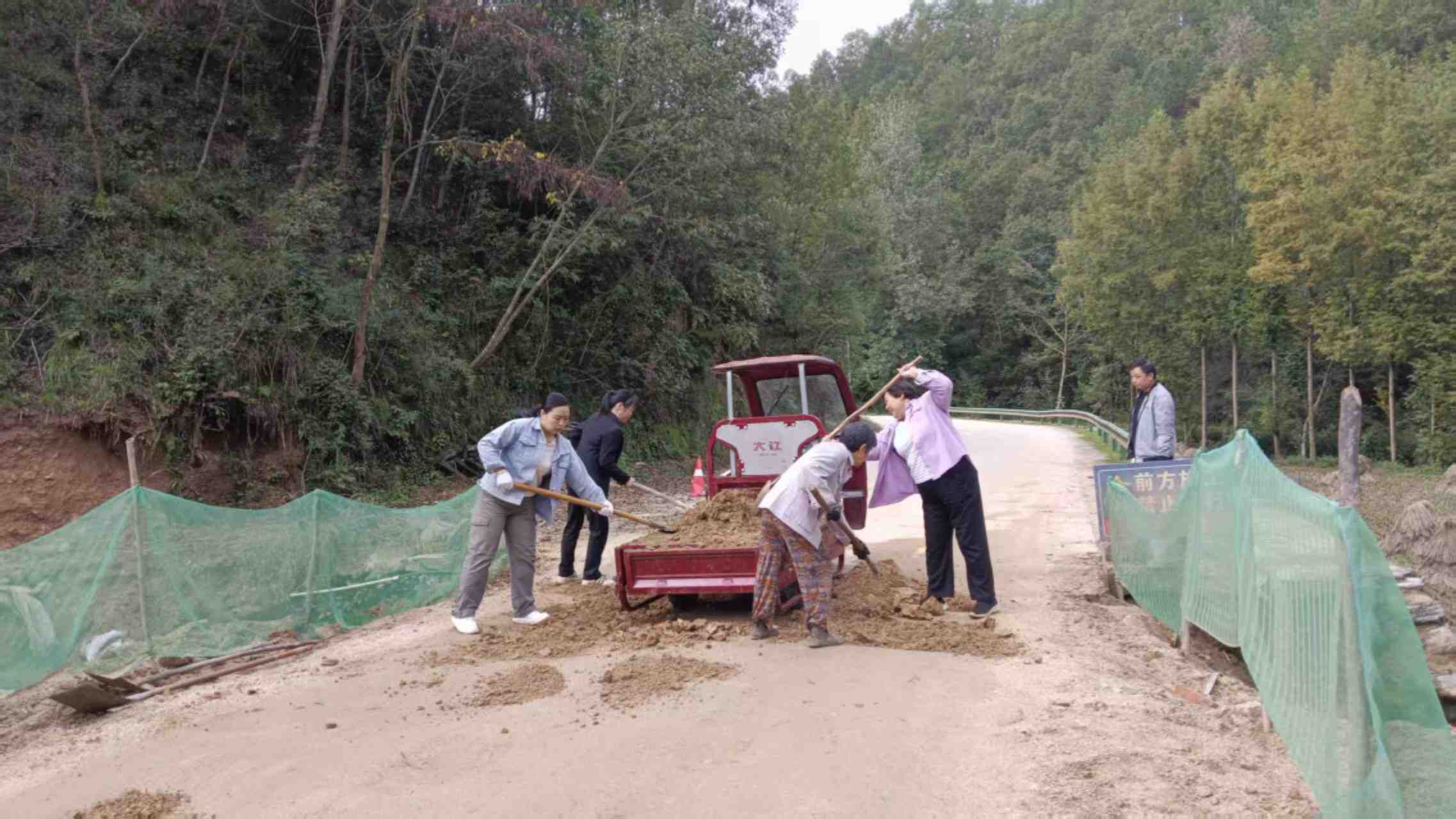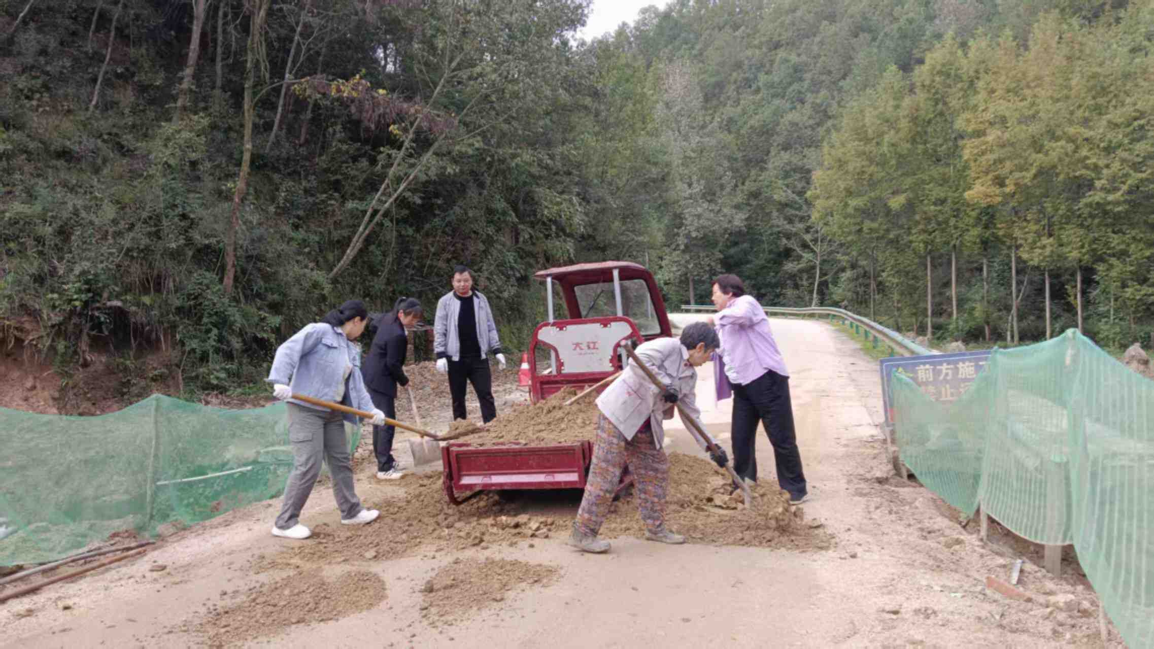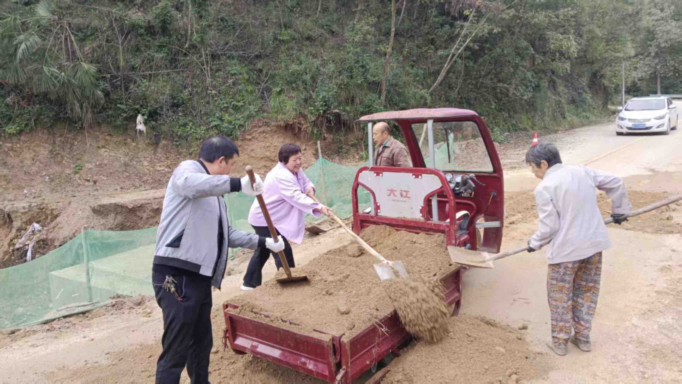 村党支部书记组织村两委及公益岗人员对二组八亩沟桥低洼路面拉沙土进行铺垫,齐心垫沙土,畅通幸福路。