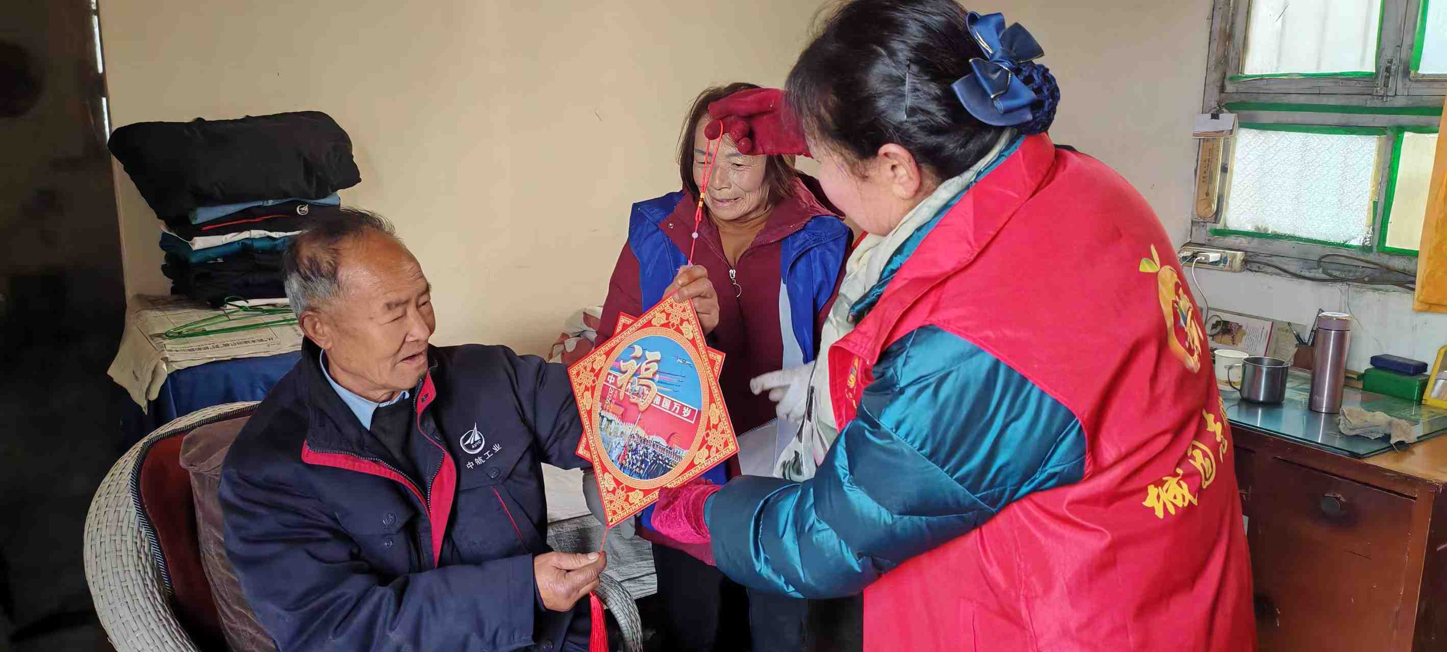 文苏村新时代文明实践站志愿者开展关心关爱活动,为退役老兵打扫卫生并送去党的关怀中国结“福”字。
